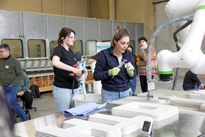 Am zweiten Tag der Veranstaltung fand der Workshop mit dem Praxisteil zum Thema „3D Printing“ statt. Die Studenten von Prof. Charlotte Thiel – Merve Karamara und Sophie Albrecht – zeigten an zwei Stationen den 3D Druck von zementbasierten Mörteln und Tonen.