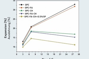 Die Auswirkungen einer korrosiven Atmosphäre auf Zementprobekörper in Gegenwart von verdünnter H2SO4 wurde untersucht und die Dehnungen als Funktion der Zeit bestimmt (Abb. 8). Die Ausdehnung des Probekörpers OPC-FA-CH war in Gegenwart von 0,5 M.-% FM zu allen Zeiten deutlich geringer als die der anderen Probekörper. Da in Gegenwart von CH+FM in Mischzementen aus OPC und FA die korrosive Wirkung von H2SO4 deutlich geringer ausfällt, ist dies ebenfalls ein Beleg dafür, dass CH und FM die Porengrößen des OPC-FA-Zementleims verkleinert und dadurch die Säure nicht in die Poren eindringen kann. Dies wird auch durch den geringsten Wert der Wasserdurchlässigkeit untermauert (Abb. 9).
