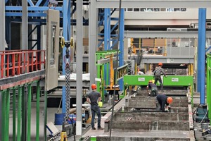 „Die Technologie selbst ist nicht kompliziert; kompliziert ist die Logistik des Handling-Systems.“ Diese Aussage aus dem Vorgespräch mit Aleksandr Kovalyov, Geschäftsführer des russischen Fertigteilwerks DSK Grad, fällt einem schlagartig wieder ein, wenn man das erste Mal in der Produktionshalle steht, vor dem Aktivlager des Systems für das automatisierte Handling von Reckli-Strukturmatrizen. Von unten betrachtet, erscheint das Gewirr der blauen Stahlschienen an der Decke des Lagers unübersichtlich, fast chaotisch. Die Schienen, über die Transporteinheiten mit den daran hängenden Matrizen...