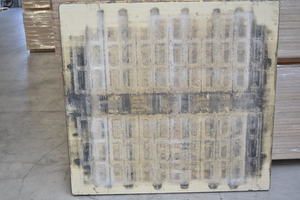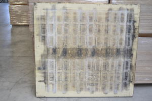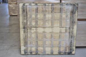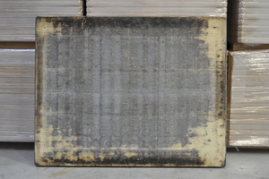 Die Bretter wurden unverpackt auf einer Europalette angeliefert. Nach Öffnen der Bänder wurden die Bretter einzeln der Palette entnommen und optisch begutachtet. Die Oberfläche der Bretter war verschmutzt, so wie es nach 12-jähriger Nutzung eines Unterlagsbretts in der Betonsteinindustrie üblich ist. Auf den Unterlagsbrettern wurden Betonsteine in unterschiedlichen Formaten und zum Teil unter Verwendung von Trennmittel auf einer Fertigungsmaschine AMEthst 1300 der Fa. AME gefertigt. Hierbei lag das Fertigungsgewicht pro Lage bei bis zu 360 kg. Laut Aussage der Fa. Steypustödin wurden im vergangenen Jahr pro Brett ca. 150 Umläufe gefahren, das entspricht hochgerechnet 1.800 Produktionszyklen in der bisherigen Nutzungsdauer. Sowohl die Oberfläche als auch die Seitenflächen der fünf Bretter wiesen keine großflächigen Beschädigungen auf.