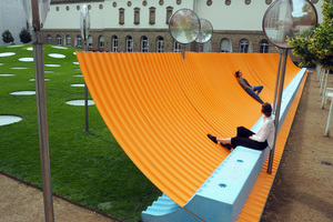 „Colormaster F“ – so nennt Manuel Franke sein monumentales, 50 m langes Kunstobjekt, das dem Garten des Frankfurter Städel Museums eine räumliche Begrenzung verleiht. Der Name lässt bereits erahnen, dass der Farbgebung eine zentrale Bedeutung zukommt: Eine orangene Wellblech-Membran ist in einen Sockel aus strahlend blau eingefärbten, auf Basis von Dyckerhoff-Weißzement hergestellten Betonelementen eingelassen. Dyckerhoff Weiss, ein Ästhet unter den Zementen, ist für die Herstellung von farbigen Bauteilen besonders gut geeignet. Durch die helle Eigenfarbe des Materials kommt die Pigmentierung zielsicher zur Geltung. Die Realisierung der Arbeit wurde durch Dyckerhoff unterstützt.