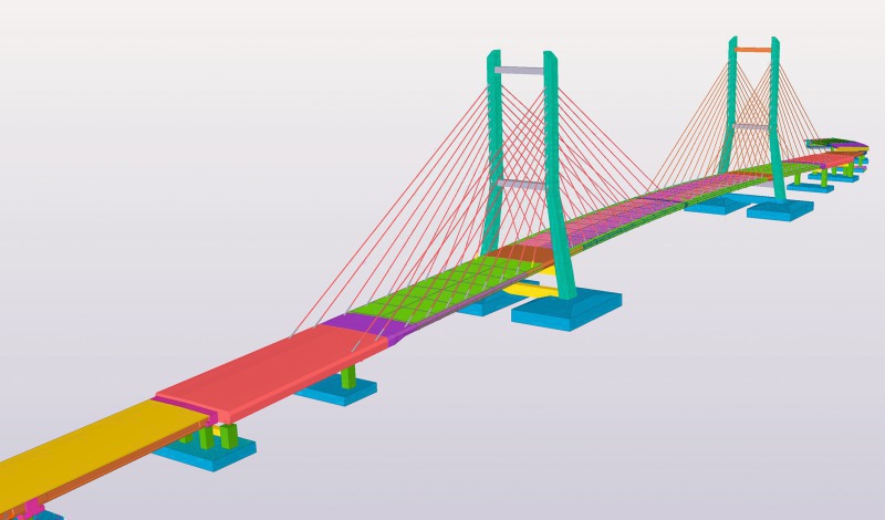 Herausragendes Referenzbeispiel für diese Anwendung ist seit Juni 2016 die 1,3 km lange Hängebrücke zwischen Kendari Old City und Kendari New City, ebenfalls auf der indonesischen Insel Sulawesi. Die seitens des Projekteigentümers Dirjen Bina Marga in Auftrag gegebene Brücke wurde von PT Pembangunan Perumahan und PT Nindya Karya entworfen und beinhaltet unter anderem rund 75.000 m³ Beton. Dank des Einsatzes von TeklaStructures wurde die Brücke von vier Detailplanern innerhalb nur eines Monats entworfen. Das 3D-Modell informiert die Baufirmen über die Wahl des am besten geeigneten Montageverfahrens und ermöglicht ihnen eine genaue Kalkulation der Position und Menge an Betonstäben. Dabei sind jeweils ein BIM-Leader, Ingenieur und Detailplaner involviert.