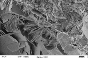 Am Institut für Bauforschung der RWTH Aachen University (ibac) wurden Schäden an dynamisch beanspruchten Betonbauteilen untersucht. Die betroffenen Bauteile wiesen trotz hoher Druckfestigkeiten Risse und Abplatzungen auf. Mit Hilfe der Rasterelektronenmikroskopie konnte Ettringit in größeren Mengen im Zementsteingefüge festgestellt werden. Als Schadensmechanismus wurde eine Kombination vermutet von den Ausgangsstoffeigenschaften, insbesondere den vergleichsweise hohen Sulfat- und Alkaligehalten des eingesetzten Portlandzementes, einer Mikrorissbildung durch hohe dynamische Belastungen und den...