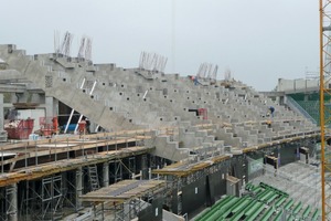 Umfang der Baumaßnahmen: technische Bearbeitung, Herstellen und Montieren von 583 Stück Tribünenteile für Unter- und Oberrang, 30 Stück Zahnbalken, 22 Stück Unterzüge, 48 Stück Treppenelemente und 875 Stück Blockstufen