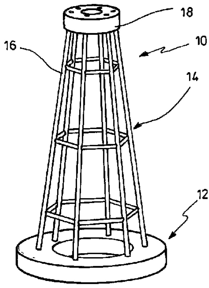 (57) Zusammenfassung: Fundament für eine Offshore-Windenergieanlage, mit einem in den Meeresboden einspülbaren Fundamentkörper und einem auf einem mit dem Fundamentkörper verbundenen Schaft, auf den ein Turm der Windenergieanlage aufstellbar ist, wobei der Fundamentkörper vorzugsweise ein Ringkörper und der Schaft eine Gitterkonstruktion ist, mit einer oberen Aufstandsplattform für den Turm und die Gitterkonstruktion in gleichen Abständen angeordnete Stützrohre aufweist, die sich...