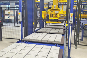 Der Anlagenring wird durch ein bewährtes Masa-System geschlossen: Der Quertransport mit Greifer transportiert die gereinigten und gewendeten Produktionspaletten zurück zur Steinfertigungsmaschine oder kann bis zu 1.080 Produktionspaletten auf dafür vorgesehenen Plätzen stapelweise zwischenlagern. Mit diesem System der Produktionspaletten-Speicherung können unterschiedliche Zykluszeiten der Frisch- und Trockenseite ausgeglichen werden. Produktions- und Handlingseite können unabhängig voneinander arbeiten – ein großer Pluspunkt hinsichtlich der Flexibilität innerhalb der Anlage.