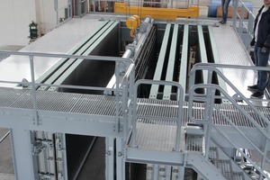 Wie ein Schmetterling mit ausgebreiteten Flügeln liegt die neue Schalung auf dem Boden der Halle von B. T. innovation in Magdeburg – links eine vorbereitete stählerne Schalfläche mit Bewehrung und Einbauteilen, rechts genauso eine vorbereitete stählerne Schalfläche; in der Mitte sind beide, jeweils 6 x 2,40 m großen Flächen durch zwei Scharniere miteinander verbunden.