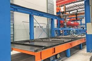 Für bis zu 800.000 m² jährliche Wand- und Deckenfläche gilt ein besonderes Augenmerk auch der Verladetechnik. Das vertikale Abheben der Doppelwände übernimmt eine Vario Tilt Hochleistungs-Kippstation, die über einen hydraulisch verfahrbaren Abstützbalken verfügt. Dieser fährt gegen die feste Randschalung und verhindert so ein Verrutschen des Betonelements während des Kippvorgangs. Der Verladevorgang selbst erfolgt sicher über eine pneumatische Abhebetraverse von Nuspl. Befestigt mittels einer speziellen Stabilisierungsvorrichtung, übernimmt diese die Doppelwand über Abhebeanker und verlädt sie auf Absetzgestelle. Elementdecken werden mittels eines Abhebegeräts horizontal in transportfähigen Stapeln bereitgestellt. Ein Smart Logistic Ausfahrhubwagen mit einer maximalen Hublast von 32 t verbindet den Verladebereich mit dem Lagerplatz im Außenbereich. Von dort werden die Verladegestelle auf einer Verfahrlänge von über 100 m auf die Endverladepositionen weitertransportiert.