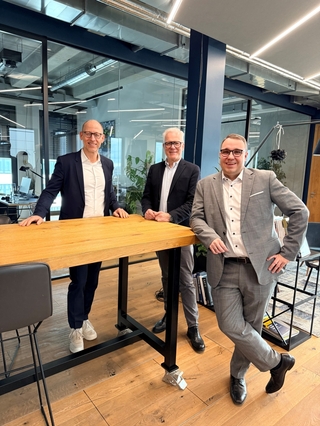 Dr. Michael Six, Geschäftsführer Goldbeck Deutschland GmbH und Chief Sustainability Officer der Goldbeck Gruppe, Thomas Zawalski, Geschäftsführer Solid Unit, Lukas Romanowski, Teamleiter Baustoffe & Zirkularität bei Goldbeck