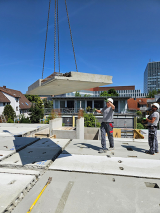Nur drei Monate vom Spatenstich bis zum Richtfest: In Erlangen verkürzte sich die Bauzeit einer studentischen Wohnanlage durch den Einsatz von Systembauteilen um circa 30 % gegenüber konventioneller Bauweise.