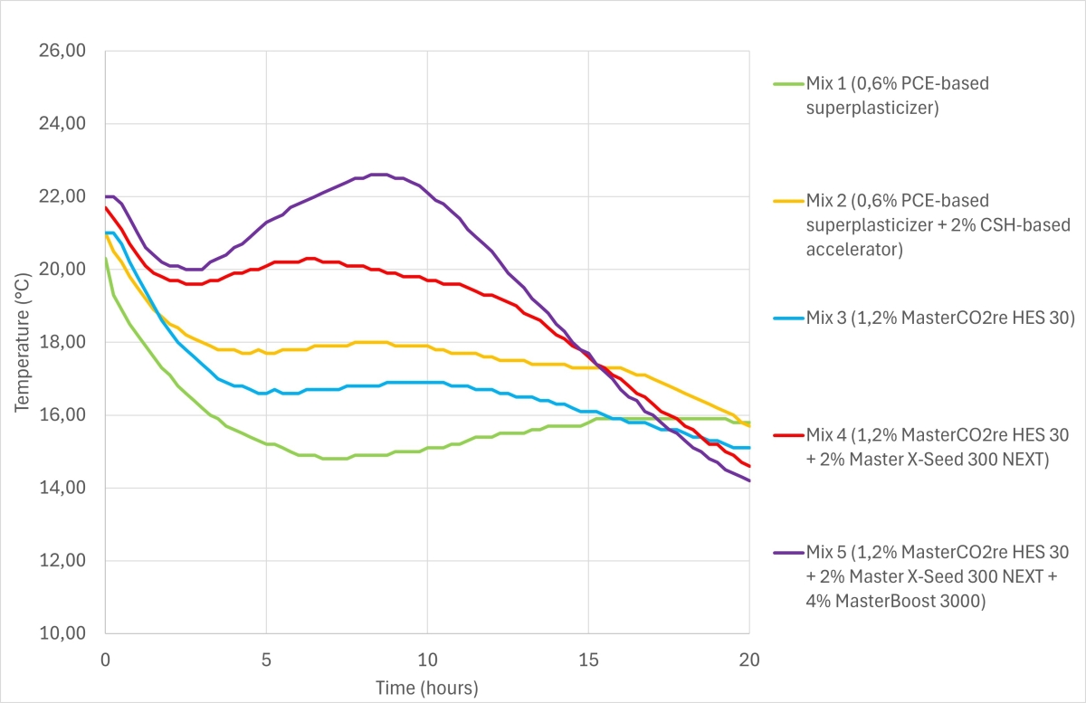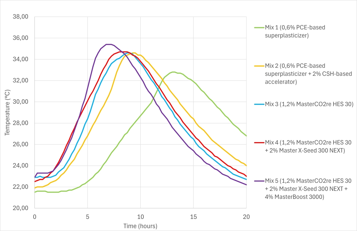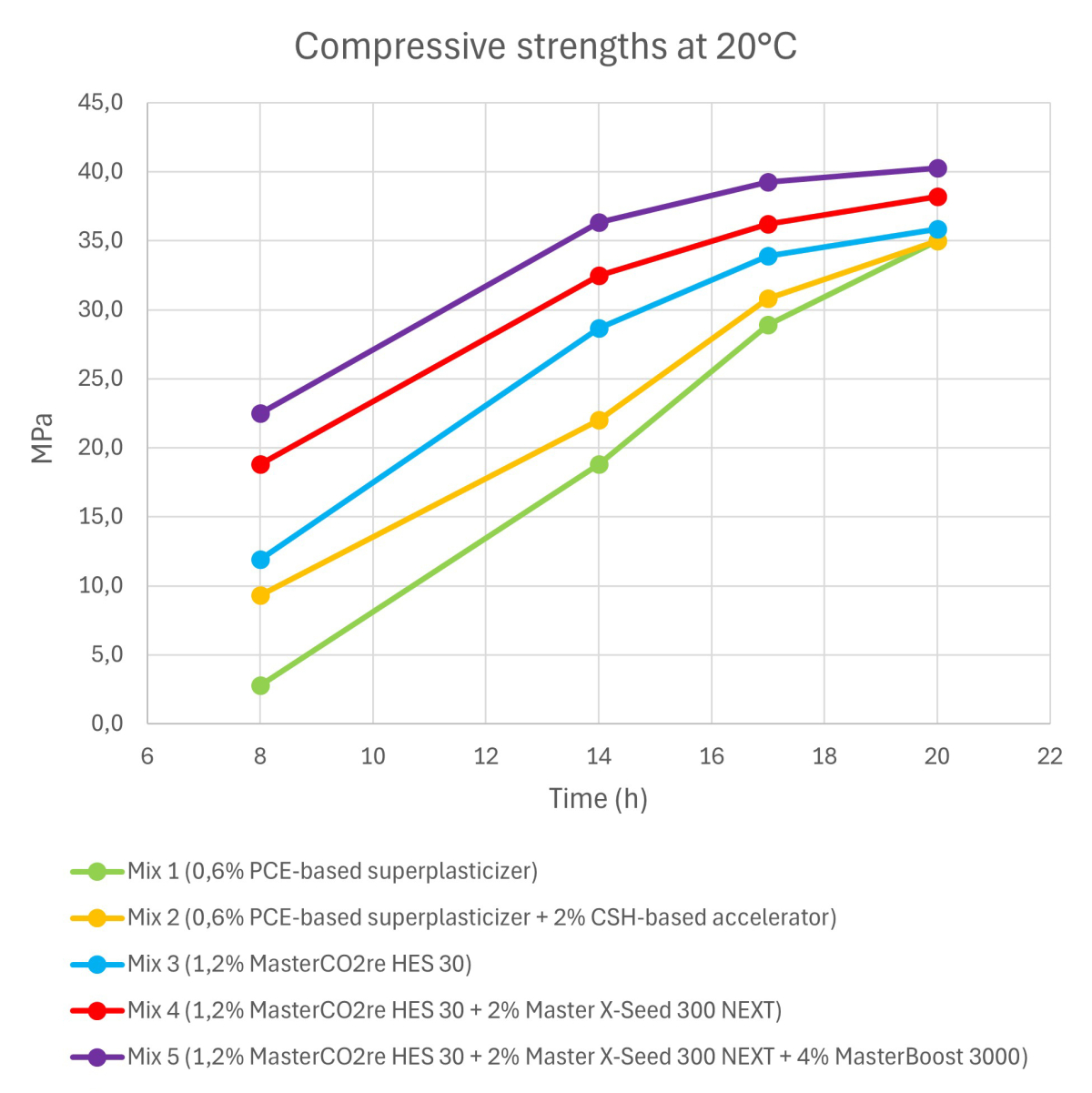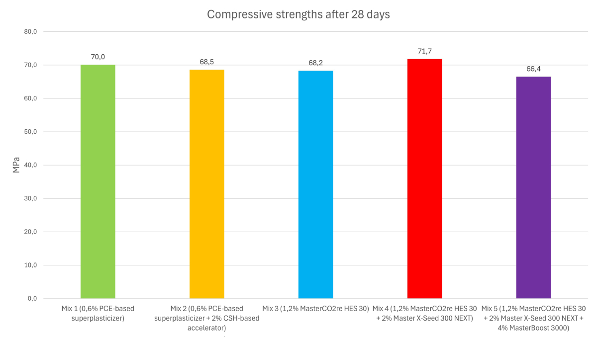 Mixes 4 and 5 further demonstrate that early-age strength development can be progressively enhanced by combining MasterCO2re HES 30 with Master X-Seed 300 NEXT, or by using the complete admixture package, which includes MasterBoost 3000 as a third component.