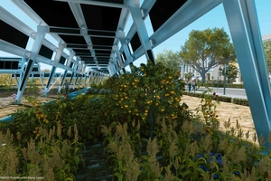 The newly developed, sustainable prefabricated frame system made of prestressed carbon-reinforced concrete was developed jointly by Ginkgo Projektentwicklung GmbH, Dresden, and Fink Ingenieure GmbH, Radebeul. This system is designed to provide a cost-effective, sustainable roofing and support structure for ground-mounted photovoltaic systems. Protecting steel frames or conventional steel-reinforced concrete against corrosion usually poses a challenge in terms of durability owing to weather impact. In contrast, carbon-reinforced concrete shows excellent resistance to these conditions. In hot climates, shading combined with controlled irrigation through the frames favors agricultural use of the land.