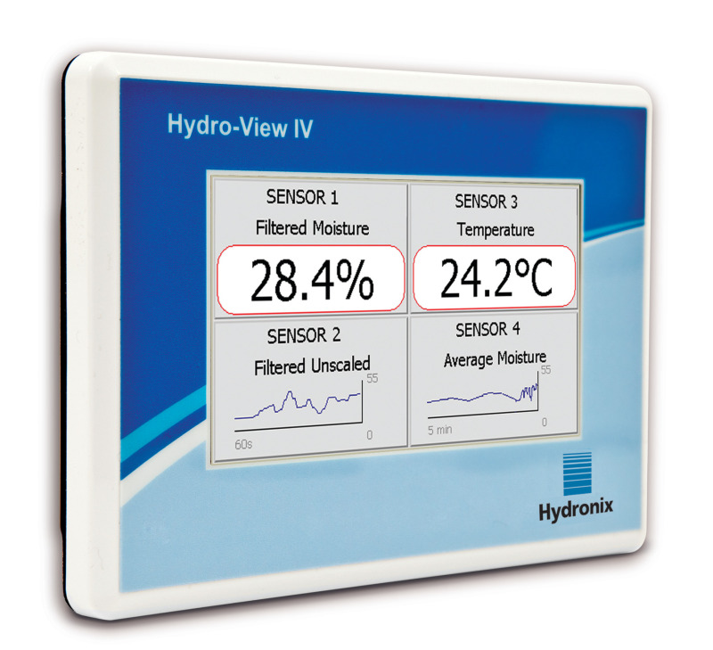 Available from the 1st May, the new Hydro-View IV, with its multi-function touch screen display is a cost effective and simple way to display measurements and configure and calibrate Hydronix sensors. Following the success of earlier Hydro-View models, the Hydro-View IV allows the easy configuration, calibration and measurement display of up to 16 Hydronix sensors. It’s main display page supports 1, 2 or 4 screen areas each of which is configurable to display a trend graph or numeric display of measurements from any connected sensor.