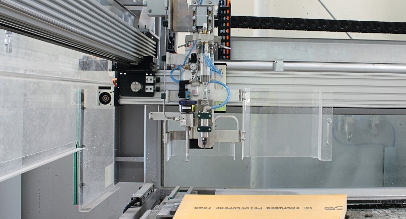 The insulation material required for the thermo-wall is manufactured in-house by Bachl itself and is cut to size by a fully automated insulation material cutter integrated into the newly installed carrousel plant. The cutter processes the insulation panels by means of a water-jet cutting system and forms them into the shapes needed in accordance with the CAD data transmitted to the cutter. The panels are then removed and placed on the pallets.