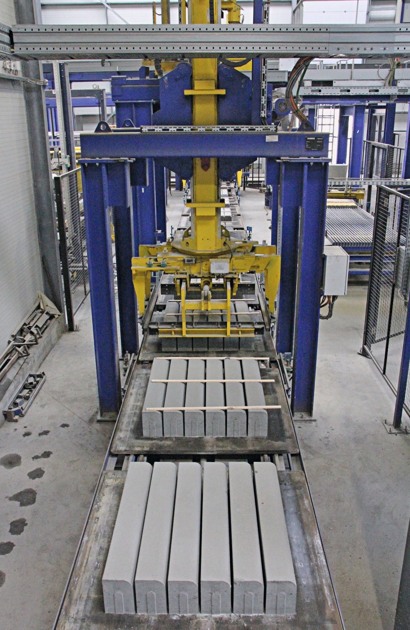 A finger car removes the up to 22 plates carrying the fresh concrete products from the lifting unit for transporting them into the 16 chambers of the curing system. Each chamber is able to accommodate a maximum of 308 plates.