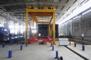 The equipment used to move out and load the elements also includes a large number of sophisticated features to ensure efficient workflows. In the lifting area, a tilting unit raises the demolded double wall unit to an angle of 80 degrees so that the elements can be lifted without damage using a shop crane even if the available space is limited. This vertical raising enables an empty formwork pallet that returns from the turning unit to pass through the area. Thus, more time is provided for lifting the finished double wall units without reducing the productivity of the production line. Loading is a safe process performed using a lifting beam that was installed by concrete accessory specialist, Nuspl. This beam is fixed by a specially designed stabilizer and uses lifting anchors to fetch the finished double wall unit, which is then loaded onto stacking frames. The precast elements are then moved out on an exit lift carriage designed for a lifting load of up to 20 tonnes that creates a link between the loading zone and the outdoor storage area.