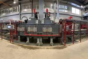 After the 180° turning process using the drum turning device, the back-mix concrete side can then be calibrated to eliminate production-related tolerances, such as conicity or variations in product thickness. For this reason, the individual layers are pushed out of the drum turning device and transferred to the calibrating machine by a subsequent layer pusher in an endless row. The calibration is done in wet mode, using two grinding discs with diamond milling segments rotating around the vertical axis. The grinding discs are driven by an electric motor with frequency control and are motor-adjustable in height.
