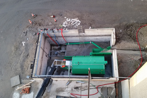 The wash water created during the wash off the wall panels (up to 40m³/h) is collected in a channel leading the wash water to a waste green concrete reclaimer RE_X 26. In this reclaimer, the particles larger than 0,250 mm are separated from the water cement mixture by principle of flotation. All particles larger than 0,250 mm are discharged via an ascending dewatering vibration chute onto a conveyor belt transferring the washed out material to a stock pile. The remaining grey water charged with fines, cement and color pigments are collected in a pump sump equipped with an agitator operating in intervals to avoid caking. Via a submersible pump this grey water is pumped to a large attenuation tank.