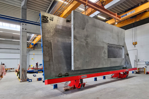 „As described, the new machine technology was optimally adapted to the existing space conditions,“ emphasizes Project Manager Roman Burau from Vollert. The fully insulated Vario Cure curing chamber forms the central core. Two opposing rack towers each are approached for the curing process via a centrally positioned, floor-mounted Vario Store storage retrieval machine. Up to 32 freshly concreted walls or empty pallets can be stored and retrieved here. For further surface finishing, the storage retrieval machine transports the wall after an initial, short curing phase to the finishing area, which is located directly above the second rack tower. A Smart Smooth trowelling machine runs by means of a bridge trolley in the transverse and longitudinal directions between two independently approachable pre-smoothing stations and processes the stripped exposed concrete side of the wall in each case. The rotation speeds and blade inclination are variably adjustable. Once the desired surface finish has been achieved, the solid wall is returned to the curing chamber for further curing.