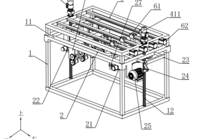 (57) The invention provides a cutting device for concrete block machining, and belongs to the technical field of concrete block machining, the cutting device comprises a rack, a lifting frame and a cutting wire, the rack is provided with a lifting assembly used for driving the lifting frame to move up and down, the lifting frame is provided with a movable frame, and the two sides of the bottom of the movable frame are provided with a pay-off assembly and a take-up assembly respectively; the lifting frame is used for installing a cutting wire, a first clamping piece and a second clamping piece which are used for fixing the cutting wire are arranged between the pay-off assembly and the take-up assembly, a driving assembly used for driving the movable frame to reciprocate is arranged on the lifting frame, and a connecting piece capable of being locked with the movable frame is arranged at the top of the second clamping piece. According to the device, through cooperation of the take-up and pay-off assembly and the wire fixing structure, the working area of the cutting wire is regularly adjusted in the cutting operation, the service life is prolonged, the maintenance cost is reduced, when the cutting wire is accidentally broken, manual work can be replaced for installing and fixing the cutting wire, and the production continuity is guaranteed.