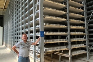Richard Trappe, General Manager of HS Anlagentechnik, was full of praise: „We are very pleased to have been trusted with this contract by OL-Trans. Because in the Mrzezino factory, we talk of a chamber system with a capacity of nearly 5,000 boards, spreading over 13 bays, a depth of 19 stacks and 16 levels á 360 mm. It is designed for production boards of L x W 1,400 x 1,100 mm and for a loading capacity of 410 kg per level. In the meantime, more than 800 HS chamber system have been sold in all corners of the world over our 50 years of company history. Even difficult environmental condition such as high earthquake, snow and wind loads are no problem at all.“ Thanks to the straightforward collaboration, installation could be achieved quickly. The well-proven HS „Snap-in“ system should also be mentioned that comes with continuous pallet guidance as well as the „ZM310“ special galvanization that is much better than a conventional batch galvanizing, according to information given by the manufacturer.