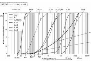 b): Bereitstellen/Berechnen von n Sieblinien (SL1, SL2, ...... SLn), die jeweils eine Korngrößen-Verteilung repräsentieren, wobei 2 < n ist;