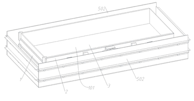(57) The invention relates to the technical field of reinforced concrete prefabricated tower column pouring, and particularly discloses a pouring mold for a reinforced concrete segment prefabricated component, the pouring mold comprises a mold body and a U-shaped frame, auxiliary positioning assemblies are symmetrically arranged on the two sides of an inner cavity of the U-shaped frame, and water storage tanks are mounted on the two sides of the outer wall of the U-shaped frame correspondingly; a water cooling assembly is installed between the auxiliary positioning assembly and the water storage tank in a matched mode, and a vibration guide assembly is installed between the two sides of an inner cavity of the U-shaped frame and used for improving the compactness and strength of concrete in the mold body. According to the pouring mold for the reinforced concrete segment prefabricated part, the auxiliary positioning assembly and the water cooling assembly are arranged in the pouring mold for the reinforced concrete segment prefabricated part, and when the pouring mold is used, through mutual cooperation of the structures, the effect of limiting diffusion of atomized water vapor for cooling can be achieved while the prefabricated part in the lower mold can be cooled.