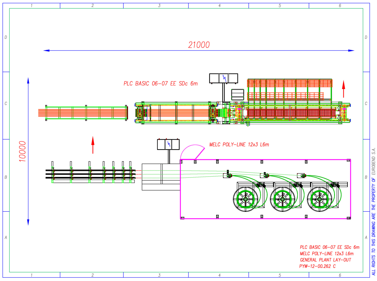 In the medium sized systems, the wire mesh is produced by a PLC Basic EE Fse welding machine, with the line wires being automatically fed into the welding line via a line wire preloading carrier unit. The cross wire is fed in via an automatic cross wire feeding magazine.