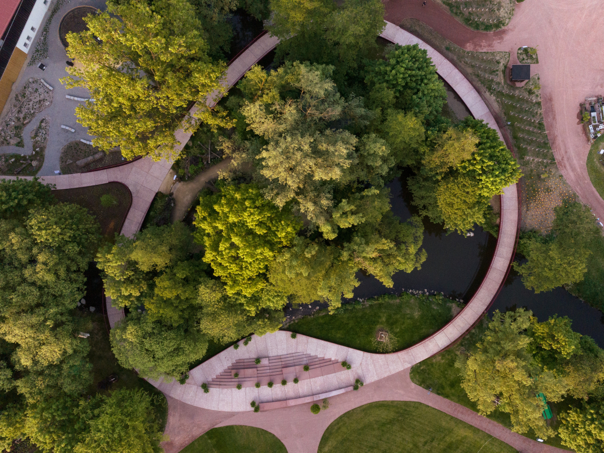 The circular path with bridges and terraces creates new recreational areas on the riverbank, offering views of nature and the old town. The sculptural railing design, also in red, formed from crescent-shaped steel slats—a homage to the supposedly hard, scaly dragon skin—provides a dynamic counterpoint to the tranquil water landscape and makes the structure an identity-defining landmark of the 2025 State Garden Show.