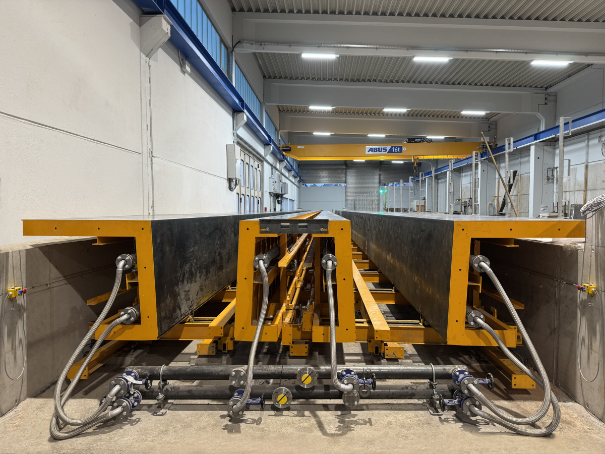 The vibration equipment, consisting of formwork with a vibrating system, was supplied by Wacker, including a frequency converter with group switching, a radio remote control, and matching distribution boxes. The compaction of the webs can be controlled separately.