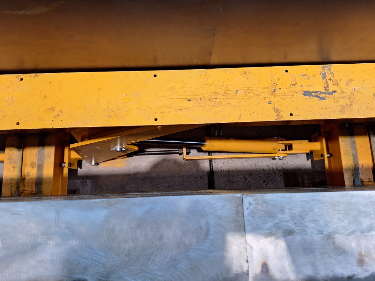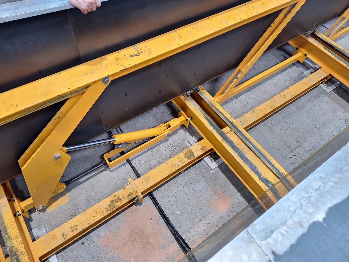 The floor formwork, consisting of multi-layer formwork panels, is provided by the client. In addition, there is a hydraulic floor height adjustment system for placing and securing a site-supplied formwork floor. This system is mechanically adjustable. The floor height adjustment can be moved up to 700 mm in height (adjustment range approx. 700 mm); the adjustment is performed by hydraulic cylinders.